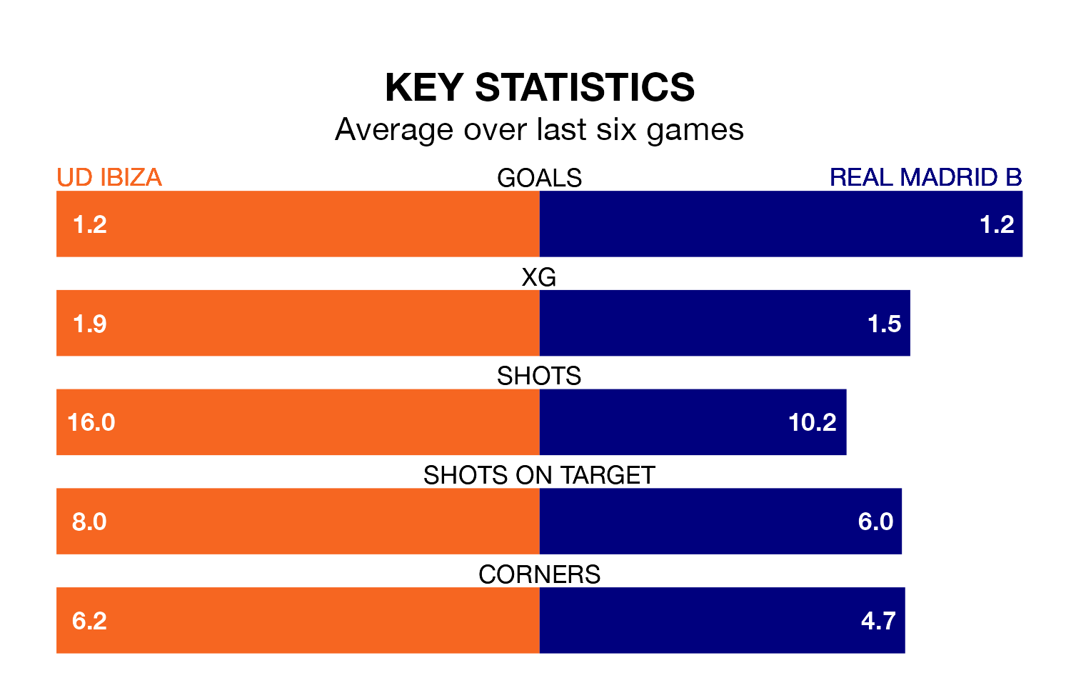 With three wins and three losses over that period, Madrid B's form is better – they have taken nine points from 18, compared to Ibiza's six.